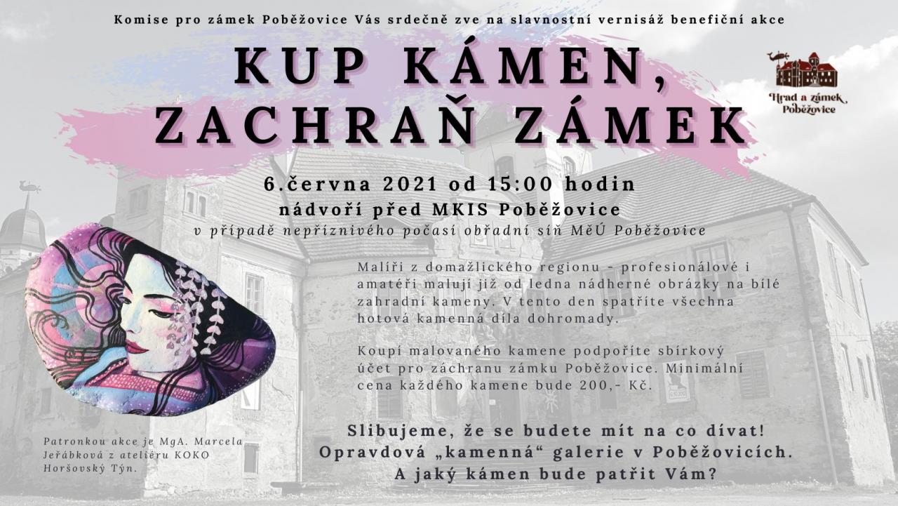 Koupí malovaného kamene podpoříte sbírkový účet pro záchranu zámku Poběžovice - Plakát k akci Kup kámen, zachraň zámek