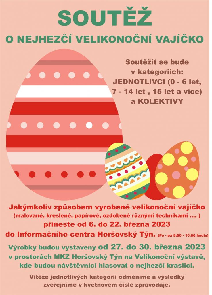 Soutěž o nejhezčí velikonoční vajíčko - jakýmkoliv způsobem vyrobené velikonoční vajíčko přineste od 6. března do 22. března 2023 do Informačního centra Horšovský Týn. Výrobky budou vystaveny na Velikonoční výstavě, kde budou návštěvníci hlasovat o nejhezčí kraslici.