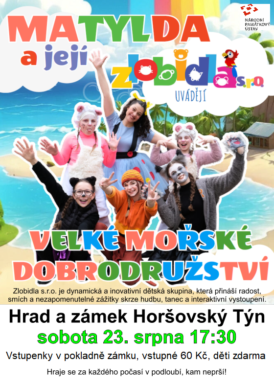 Matylda a její zlobidla uvádějí akci Velké mořské dobrodružství. Předprodej vstupenek na pokladně zámku Horšovský Týn. DĚTI VSTUPNÉ ZDARMA, dospělí 60 Kč.